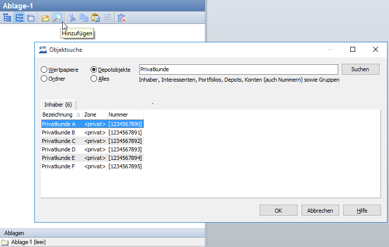 Um Objekte in die Ablage zu bringen, klicken Sie auf das Icon "Hinzufügen". Es öffnet sich die Objektsuche.