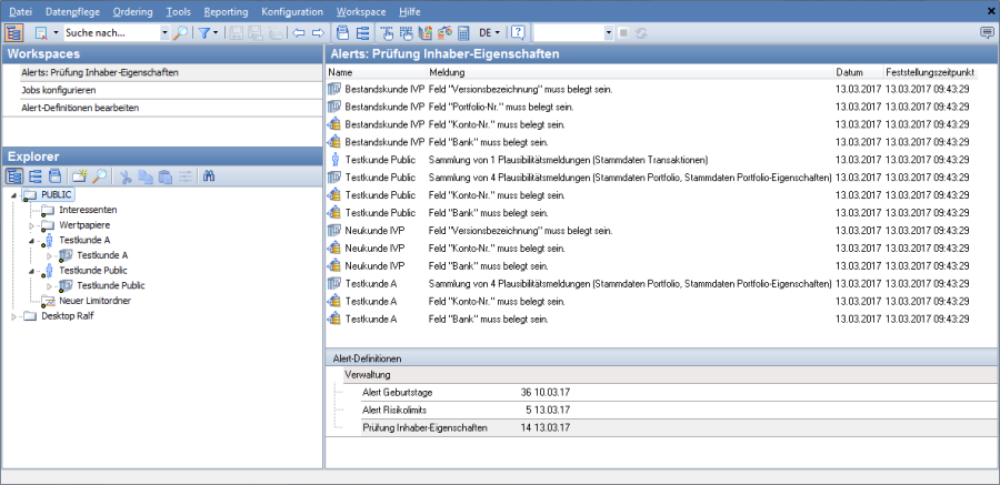 Wählen Sie das Icon "Alert-Anzeige", so werden im Auswertungsbereich die kompletten Alerts inklusive Datum, Feststellungszeitpunkt, Meldung usw. angezeigt.
