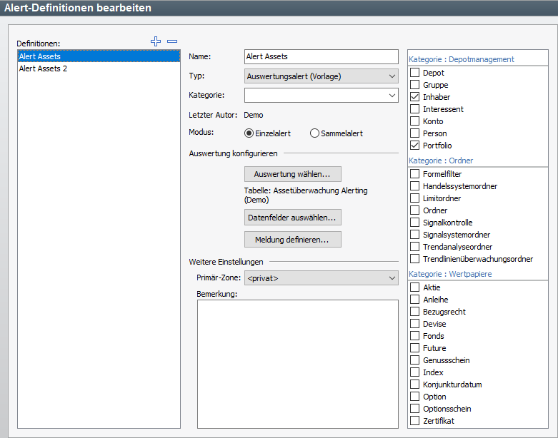 Bemerkung | Geben Sie hier eine Bemerkung zur Alert-Definition ein, die z. B. als Dokumentation für Kunden hilfreich ist. |