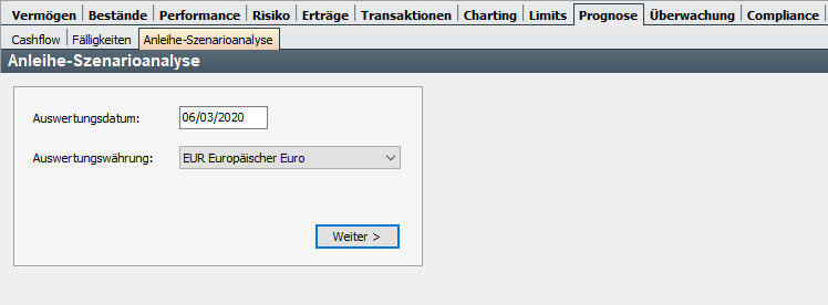 Zunächst erscheint ein Vordialog, in dem Sie ein Auswertungsdatum (Settlement) und eine Auswertungswährung auswählen. Diese Parameter gelten für alle Analysen, die Sie mit diesem Tool anstoßen, und können später in der gleichen Arbeitssitzung nicht mehr verändert werden. Wählen Sie nach Festlegung der Parameter den Button "Weiter". Das Analysetool wird geöffnet.