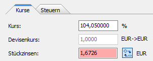 Sie erkennen die aktivierte Logikumkehr nach Ihrem Mausklick auf das Icon "Logikumkehr" an der roten Einfärbung des Eingabefeldes "Stückzinsen".