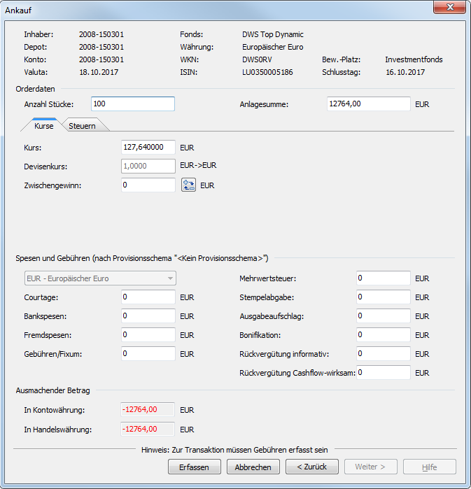 Für Fonds steht hier immer der Rücknahmepreis. Der Ausgabeaufschlag erscheint separat in den Gebühren auf der rechten Seite des Dialogfensters.