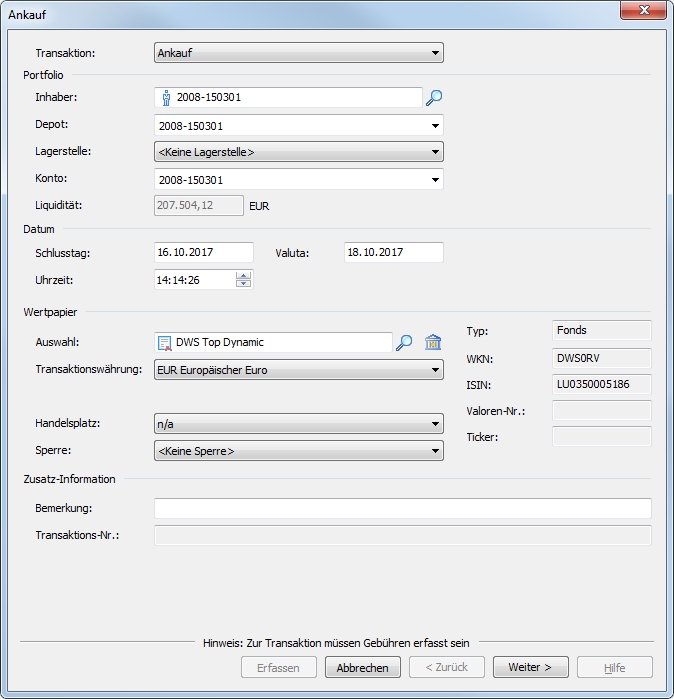 Als Information sehen Sie in den Dialogfenstern zum Erfassen von Transaktionen rechts auch Typ, Bewertungswährung, WKN, ISIN, Valorennummer und Ticker des Wertpapiers.