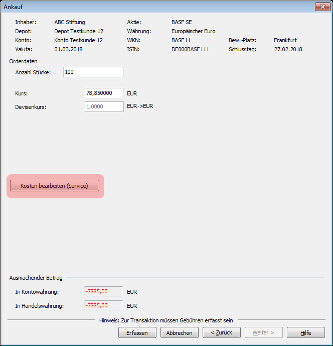Es erscheint die zweite Seite, auf der Sie die weiteren Angaben zur Transaktion machen. Ganz oben finden Sie hier die von der ersten Seite des Dialogfensters übernommenen Informationen (Inhaber, Depot, Konto, Wertpapier…). Haben Sie das Modul "Kostenservice" lizenziert und eine Internetverbindung zum Service, dann können Sie über den entsprechenden Button die zugehörigen Kosten des Ankaufs direkt aus dem Kostenservice downloaden.