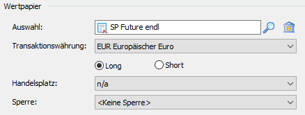 Bei Optionen und Futures ist es üblich, auch short zu gehen. Außerdem kann man auch gleichzeitig mit der gleichen Option bzw. dem gleichen Future short und long sein. Beim Erfassen von Optionen und Futures hat man nun die Möglichkeit der Angabe von "Long" bzw. "Short" durch Aktivieren der gleichnamigen Optionen im Dialogfenster "Ankauf".