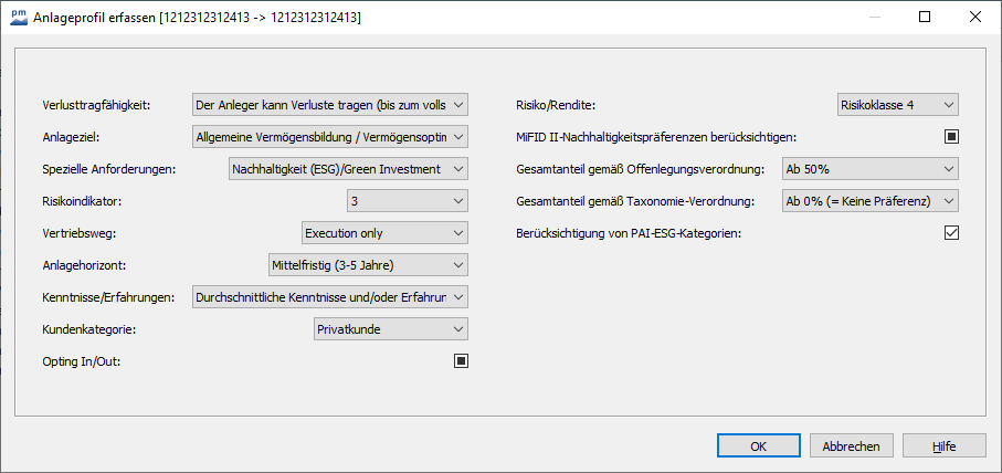 | MiFID-II-Nachhaltigkeitspräferenzen berücksichtigen | Aktivieren Sie dieses Kontrollkästchen, wenn bei der Profilierung die MiFID-II-Nachhaltigkeitspräferenzen berücksichtigt werden sollen. |