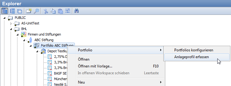 - Wählen Sie im Explorer im Kontextmenü des Portfolios den Befehl PORTFOLIO, ANLAGEPROFIL ERFASSEN.
