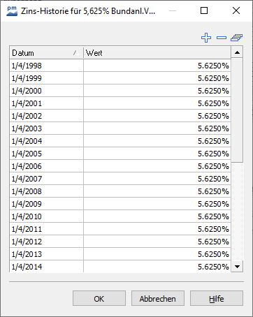 Als Zinstermin wird, sofern nicht vorhanden, der 1. 1. verwendet. Beim Generieren der Zins-Historie entspricht der erste Eintrag der Zins-Historie dem Emissionsdatum und der letzte Eintrag der Laufzeit. Dazwischen wird entsprechend Zinstermin und -intervall aufgefüllt. Der Zinssatz wird bei jedem Eintrag entsprechend dem Stammdatum "Zinssatz" gesetzt.
