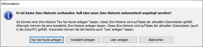 Wenn die notwendigen Stammdaten (Erster Handelstag usw.) ganz oder teilweise fehlen, können Sie die Zins-Historie auch manuell anlegen.