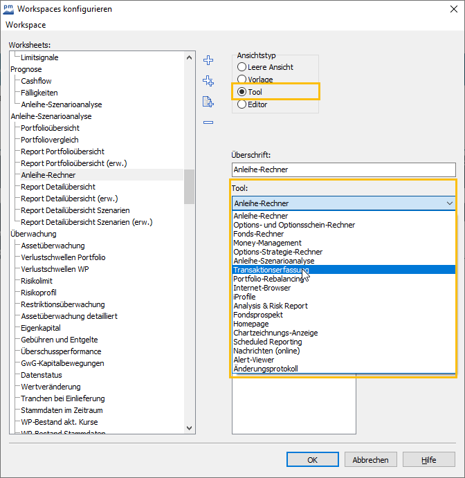 Beachten Sie, dass es den Begriff "Tools" auch bei der Konfiguration von Workspaces gibt. Dort begegnen Ihnen neben den zuvor hier beschriebenen Werkzeugen, die Sie alle über die Registerkarte "Tools" im Menüband erreichen, weitere Worksheets vom Ansichtstyp "Tool". Ein prominentes Beispiel ist die Erfassungsmaske für Transaktionen.