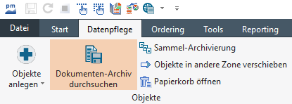 Das Dokumenten-Archiv können Sie über das Icon "Dokumenten-Archiv durchsuchen" auf der Registerkarte "Datenpflege" öffnen. In diesem Fall ist zunächst kein Depotobjekt ausgewählt und Sie können über den Suchbereich den gewünschten Inhaber (bzw. Gruppe, Portfolio, Interessent, Depot oder Konto) auswählen und nach dessen Dokumenten suchen.