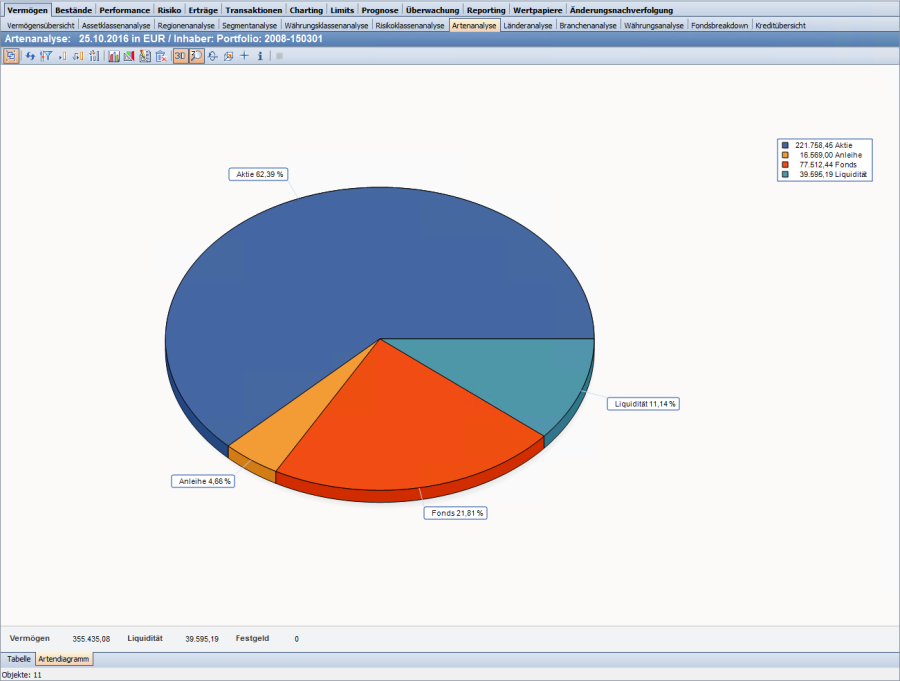 Das Tortendiagramm zeigt den Wertanteil der einzelnen Depotpositionen gruppiert nach Arten sowie den Anteil der Liquidität am Vermögen. Auch hier fließen ggf. vorhandene Kredite mit negativen Werten ein.