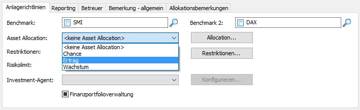 - Über den Button "Allocation…" haben Sie die Möglichkeit, das Dialogfenster "Asset Allocation" zu öffnen und die Asset-Allocation-Modelle zu bearbeiten.