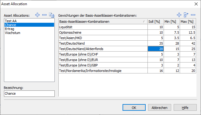 Sie können die vordefinierten Asset-Allocation-Modelle bearbeiten, um sie Ihren Bedürfnissen anzupassen, über die Funktion "Kopieren" schnell Varianten anlegen und bearbeiten oder auch ganz neue Asset-Allocation-Modelle erstellen.