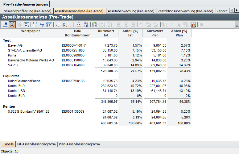 Die "Assetklassenanalyse (Pre-Trade)" basiert auf der bekannten tabellarischen Auswertung Assetklassenanalyse. Optimiert für Rebalancing-Portfolios vergleicht die "Assetklassenanalyse (Pre-Trade)" Ist- und Plan-Werte für Kurswerte und Anteile am Depot. Neben der tabellarischen Auswertung stehen Ihnen auch zwei Diagramme zum Vergleich zur Verfügung.