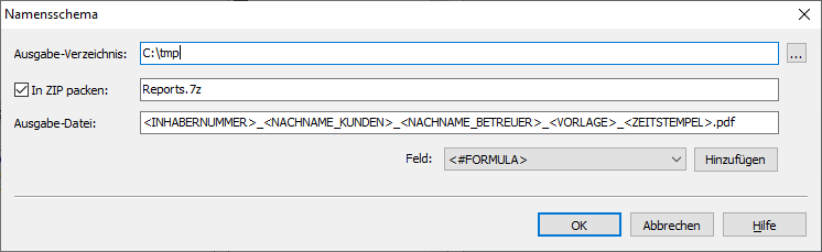 Optional können Sie die exportierten Dateien auch in ein ZIP-Archiv packen. Aktivieren Sie dazu das Kontrollkästchen "In ZIP packen" und geben Sie in das zugehörige Eingabefeld den gewünschten Namen für das ZIP-Archiv. Wichtig ist, dass die Dateiendung ".7z" lautet. Für den Namen des ZIP-Archivs können Sie analog zum Namen der Ausgabe-Datei darunter auch die vorgefertigten Bausteine verwenden oder über den Eintrag <FORMULA> neue Namensbestandteile definieren. Lesen Sie zu weiteren Details das Kapitel Reports in ZIP-Archiven speichern.