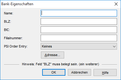 Wählen Sie das Icon "Neue Bankverbindung anlegen". Es erscheint das Dialogfenster "Bank-Eigenschaften". Geben Sie hier Name, Bankleitzahl (BLZ), Business bzw. Bank Identifier Code (BIC) sowie ggf. Filialnummer und – falls Sie mit einem PSI Order Entry Online-Broking über diese Bank nutzen wollen – das PSI Order Entry ein. Über den Button "Adresse…" gelangen Sie in das Dialogfenster "Adresse-Eigenschaften", in dem Sie eine Adresse für die Bank anlegen können. Lesen Sie dazu ggf. den Abschnitt Adressen.