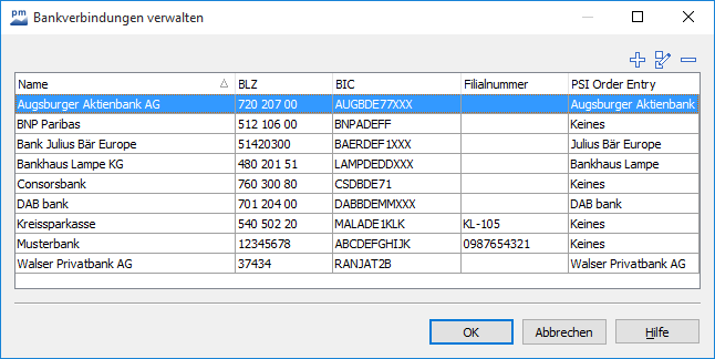 Wählen Sie auf der Registerkarte "Datenpflege" den Befehl BANKVERBINDUNGEN im Menü des Icons "Objekte verwalten". Es erscheint das Dialogfenster "Bankverbindungen verwalten".