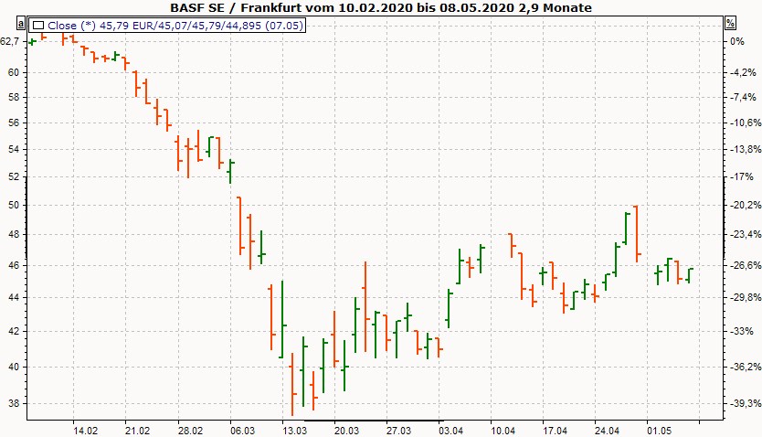 Bar-Charts (oder Balken-Charts) bestehen, wie der Name schon sagt, aus Balken (Bars). Dabei stellt das obere Ende des senkrechten Strichs den Höchstkurs, das untere Ende den Tiefstkurs dar. Der kleine waagerechte Strich rechts daneben ist der Schlusskurs. Auf Wunsch können Sie auch den Eröffnungskurs als waagerechten Strich links darstellen. Diese Darstellung ist allerdings bei der klassischen Bar-Chart Analyse nicht gebräuchlich.