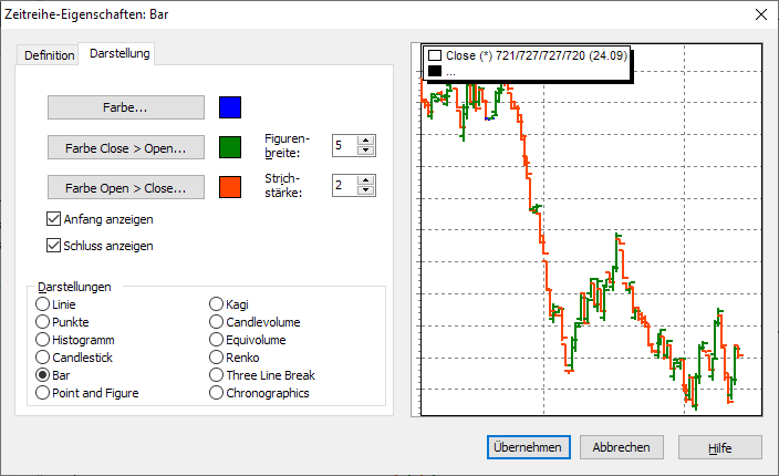Anfang/Schluss anzeigen | Ist dieses Kontrollkästchen aktiviert, markiert eine kleine waagerechte Linie den Eröffnungs- bzw. den Schlusskurs. Standardmäßig sind beide Kontrollkästchen aktiviert. |