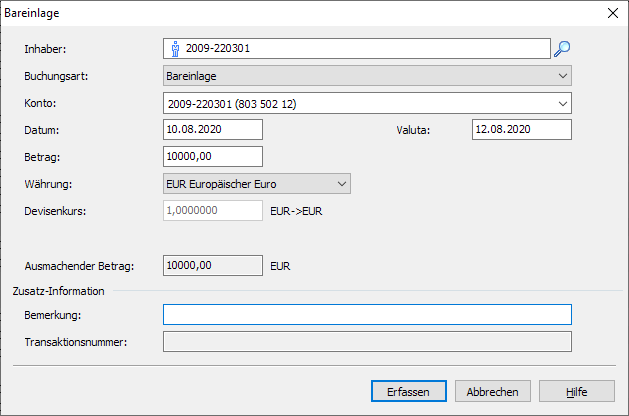 In diesem Feld müssen Sie die Währung eingeben, in der die Bareinlage erfolgt ist. Voreingestellt ist die Währung des Kontos.
