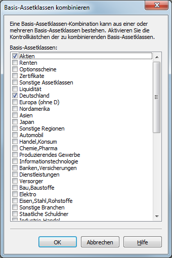 In dieser Liste finden sich alle konfigurierten Basis-Assetklassen: Assetklassen, Regionen, Segmente (Branchen) und Währungsklassen. Sie können eine einzelne Basis-Assetklasse markieren oder eine mehrstufige Asset Allocation durch Kombination mehrerer Basis-Assetklassen bilden (z. B. Automobilaktien aus Deutschland).