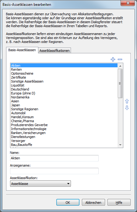 Im erscheinenden Dialogfenster "Basis-Assetklassen bearbeiten" legen Sie neue Basis-Assetklassen an, bearbeiten die bestehenden und löschen ggf. nicht mehr benötigte.