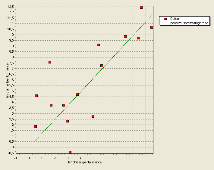 Für die positive Elastizität, d. h. die Abhängigkeit der Wertpapierperformances in einer steigenden Marktphase von der Basispapierperformance, ist das Modell