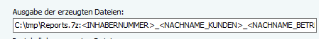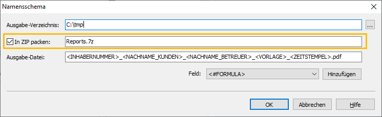 - Für den Namen des ZIP-Archivs können Sie analog zum Namen der Ausgabe-Datei darunter auch die vorgefertigten Bausteine verwenden oder über den Eintrag <FORMULA> neue Namensbestandteile definieren.