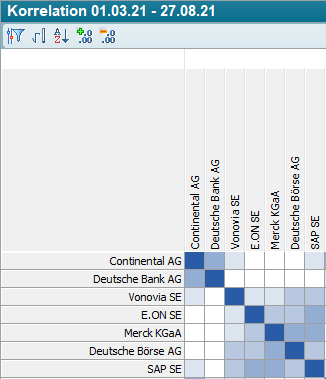 | Den Zahlen in den Zellen der Korrelationsmatrix wird bei jedem Anklicken eine Dezimalstelle entfernt. Dabei kann die Zahlenanzeige auch ganz ausgeblendet werden, so dass eine reine Farbdarstellung erfolgt: