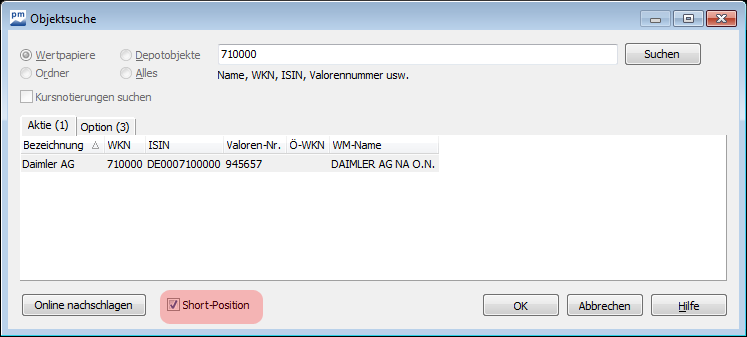 - Neue Short-Positionen lassen sich manuell in die Ansicht aufnehmen: Per Drag & Drop wird bei gedrückter <UMSCHALT>-Taste (<SHIFT>) eine Short-Position angelegt. Bei "Neue Wertpapierposition aufnehmen" erscheint ein Kontrollkästchen zur Auswahl von Short-Positionen im Suchdialog.