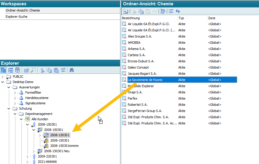 Achten Sie darauf, dass im Explorer (links) das Depot, in das Sie das Wertpapier verschieben möchten, angezeigt ist.