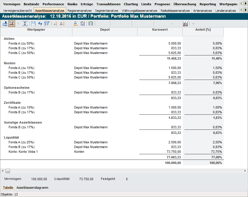 Der Inhaber "Max Mustermann" hat drei Wertpapiere vom Typ "Fonds" im Depot. Diesen Fonds ist über das benutzerdefinierte Feld "Assetklassen-Split" jeweils eine Gewichtsverteilung hinterlegt. Die Assetklassenanalyse splittet dann die Fonds entsprechend ihrer Gewichte auf die einzelnen Assetklassen auf. In der Positionsbezeichnung wird ein von 100% abweichendes Gewicht mit dem Zusatz "zu (xx%)" angezeigt. In den übrigen Spalten ist das Anteilsgewicht entsprechend verrechnet.