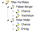 Subfilter können unter demselben Namen mehrfach vorkommen. Sie lassen sich in Auswertungen verwenden, können aber nicht in andere Ordner oder Gruppen gezogen werden.