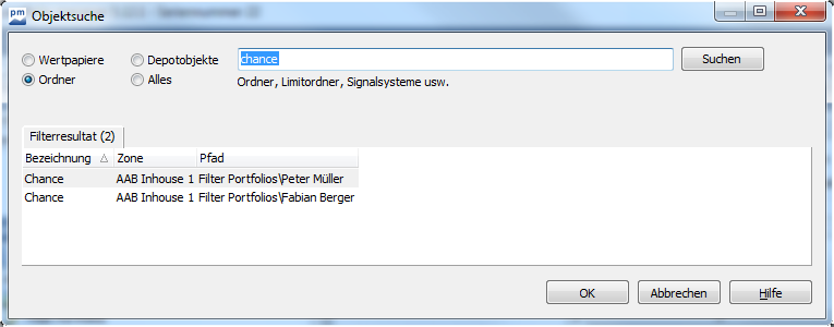 In der Objektsuche wird dieser Ordnertyp als Filterresultat auf einer eigenen Registerkarte aufgeführt, neben dem Namen des Subfilters wird der relative Pfad zum generierenden Filter angezeigt: