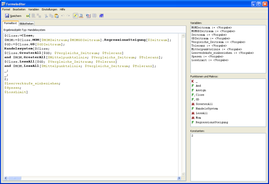 Das "Bezeichnungsschema" bestimmt den Namen des Signalsystems in der Chartanzeige. - Geben Sie über den Button "Formel" die Formel in den Formeleditor ein, sie ist das Herzstück des Handelssystems.