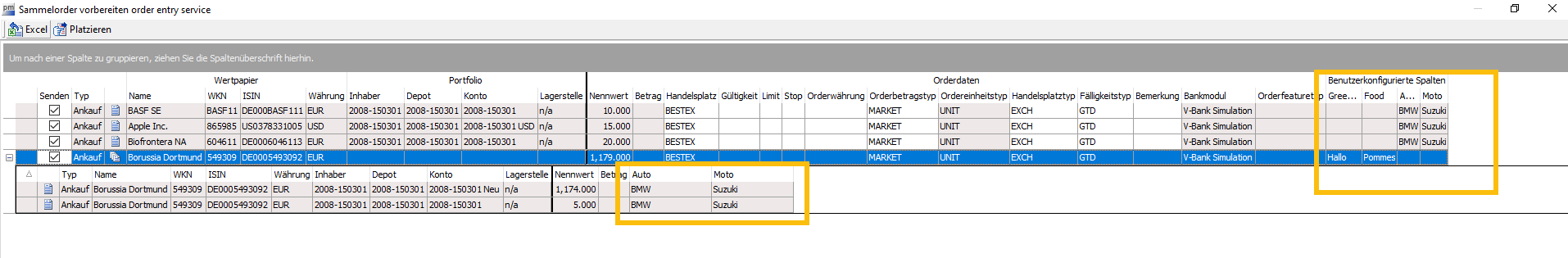 Die nur für Blockorders konfigurierten Spalten "Greeting" und "Food" bleiben für Einzelorders leer und umgekehrt zeigen auch die nur für Einzelorders konfigurierten Spalten für Blockorders keine Werte an. Für die in den Blockorders enthaltenen Einzelorders werden diese Werte aber ebenfalls zugewiesen und angezeigt.