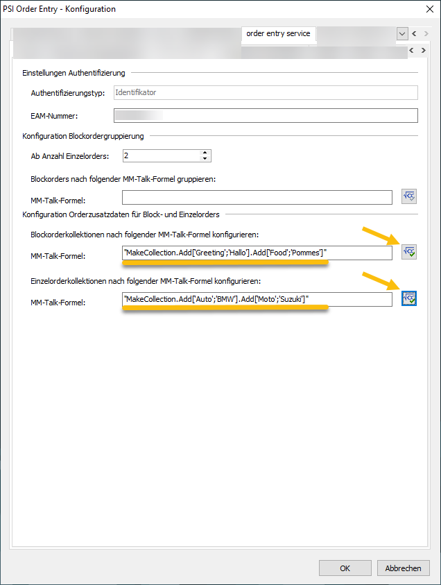 Öffnen Sie über die Formel-Icons auf der rechten Seite den Formeleditor, geben Sie dort die folgenden MM-Talk-Funktionen für Block- und Einzelorderkollektionen ein und speichern Sie diese: