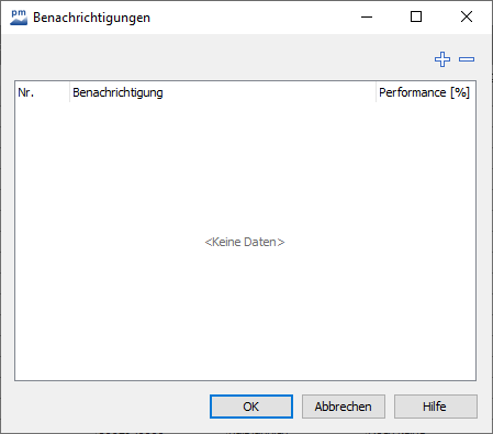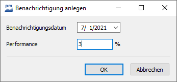Wählen Sie den Button ganz rechts in der gewünschten Zeile. Das Dialogfenster "Benachrichtigungen" wird geöffnet. Hier können Sie neue Daten hinzufügen oder bestehende Daten löschen. In der Spalte "Benachrichtigung" sehen Sie das jeweilige Benachrichtigungsdatum, in der Spalte "Performance [%]" die von Ihnen ggf. erfasste prozentuale Performance.