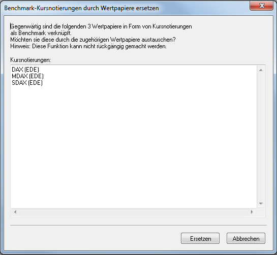 Es erscheint das Dialogfenster "Benchmark-Kursnotierungen durch Wertpapiere ersetzen". In diesem Dialogfenster sehen Sie eine Liste mit allen Kursnotierungen, die aktuell als Benchmarks verknüpft sind.
