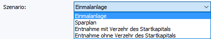 - Wählen Sie ein Szenario (Einmalanlage, Sparplan usw.) aus der Liste. Die Szenarien und ihre Möglichkeiten werden nachfolgend noch erläutert.