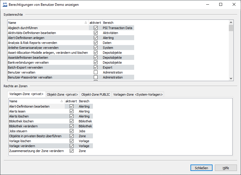 Wechseln Sie über die einzelnen Registerkarten zu den Sie interessierenden Zonen. Die Häkchen in der Spalte "aktiviert" zeigen Ihnen, welche Rechte zurzeit für den angemeldeten Benutzer verfügbar sind. - Beenden Sie das Dialogfenster mit dem Button "Schließen".