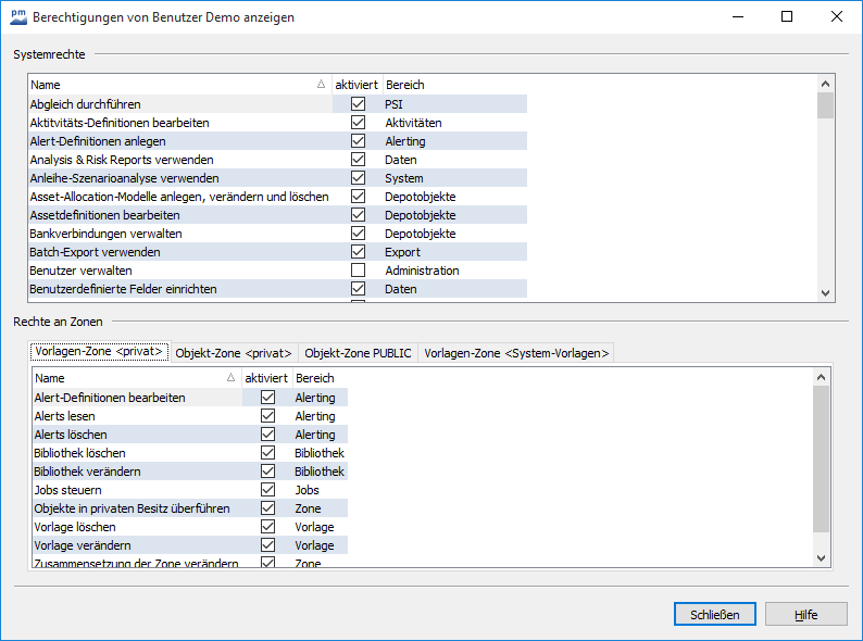 Oben sind die System-Rechte zu sehen. Unten sehen Sie die Objekt-Rechte an der jeweiligen Zone. Die Objekt-Rechte sind hierbei jeweils nach Vorlagen-Zone oder Objekt-Zone vorgefiltert. Wechseln Sie über die einzelnen Registerkarten zu den jeweiligen Zonen. Die Häkchen in der Spalte "aktiviert" zeigen Ihnen, welche Rechte zurzeit für den angemeldeten Benutzer verfügbar sind.