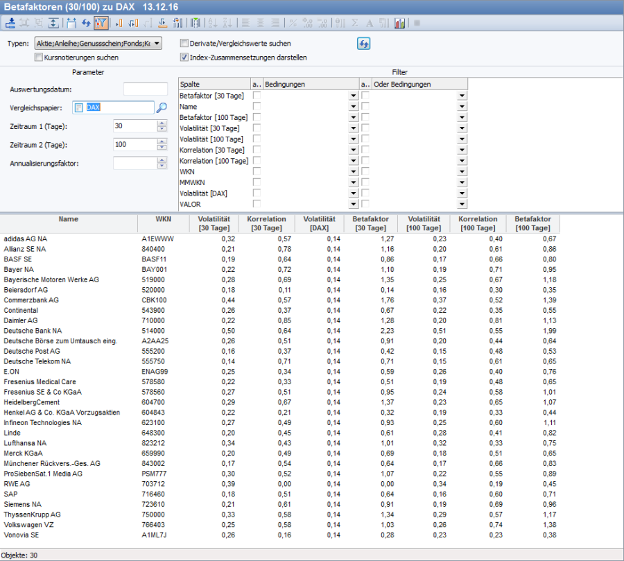Die Auswertung "Betafaktoren" gibt einen Überblick über Volatilität, Korrelation und Betafaktoren.