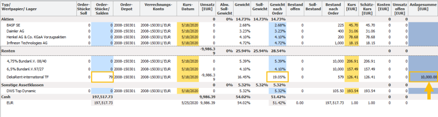 In der Spalte "Orders (geplant)/Salden" wird die maximal mögliche Stückzahl für diesen Anlagebetrag berechnet, in der Spalte "Gewicht nach Order" das entsprechende Gewicht. Dabei wird auch die Stückelung des Fonds aus den Stammdaten berücksichtigt. Eine manuelle Eingabe in diesen Spalten ist bei Betragsorders nicht sinnvoll und somit auch nicht möglich.