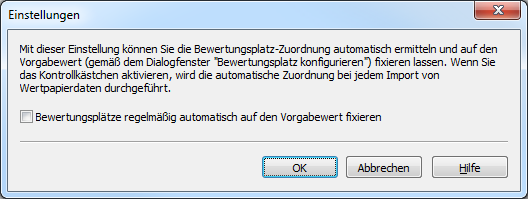Dieses Kontrollkästchen ist im Auslieferungszustand deaktiviert. Bevor sie es aktivieren, sollten Sie zunächst die Standardzuordnung im Dialogfenster "Bewertungsplatz konfigurieren" einrichten. Sie öffnen das Dialogfenster über den Befehl BEWERTUNGSPLÄTZE auf der Registerkarte "Konfiguration".