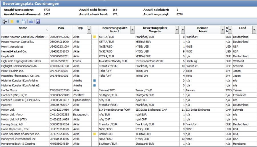| Mit dem Speichern-Icon fixieren Sie die Bewertungsplatz-Zuordnungen für die momentan dargestellten und ausgewählten Wertpapiere. Dazu wird die Vorgabe (Spalte "Bewertungsplatz Vorgabe") als Fixierung übernommen. |