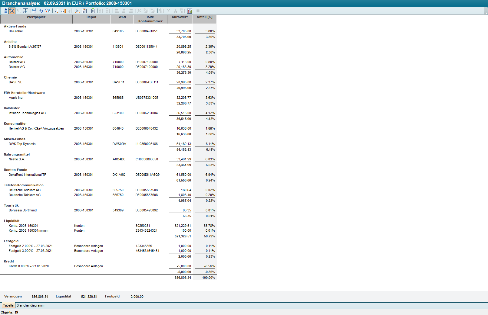 Wenn Sie erfahren möchten, auf welche Branchen die Wertpapiere in den Depots verteilt sind, öffnen Sie die Auswertung "Branchenanalyse". Hier werden die einzelnen Branchen sowie deren prozentualer Anteil an einem Depot (oder allen Depots eines Inhabers bzw. eines Portfolios) dargestellt.
