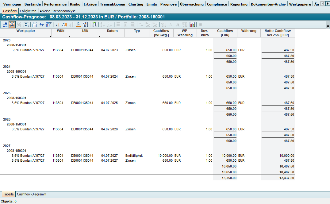 Der Infront Portfolio Manager listet in der Prognose für jedes Jahr im Betrachtungszeitraum die prognostizierten Cashflows in Auswertungswährung auf. Außerdem ist eine Zwischensumme pro Jahr sowie die Gesamtsumme der Cashflows verfügbar.