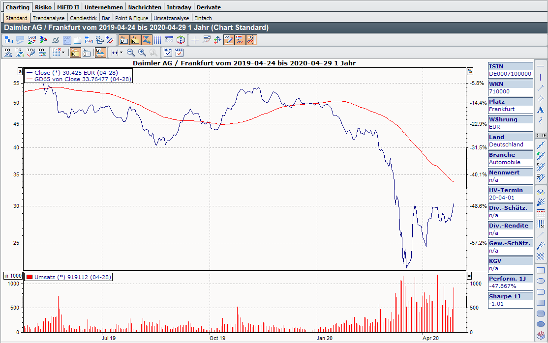 Per Mausklick auf diese Registerkarten können Sie die wesentlichsten Chartfunktionen für das aktuelle Wertpapier erreichen, z. B. den Trendanalyse-Chart und weitere Chartformen (Bar-Chart, Candlestick-Chart usw.). Oder Sie wechseln über ein anderes Worksheet etwa in den Intraday-Bereich.